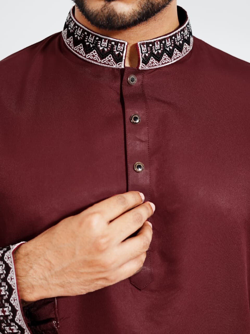 নিখুঁত কাজ: গলা এবং হাতায় নিখুঁত এমব্রয়ডারি ও কন্ট্রাস্টের কাজ যা আপনাকে দিবে স্মার্ট লুক।