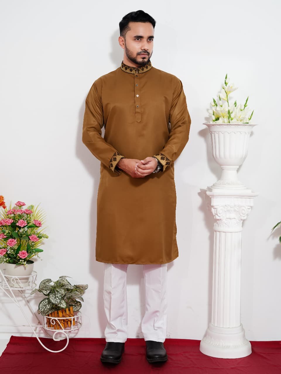 নিখুঁত কাজ: গলা এবং হাতায় নিখুঁত এমব্রয়ডারি ও কন্ট্রাস্টের কাজ যা আপনাকে দিবে স্মার্ট লুক।